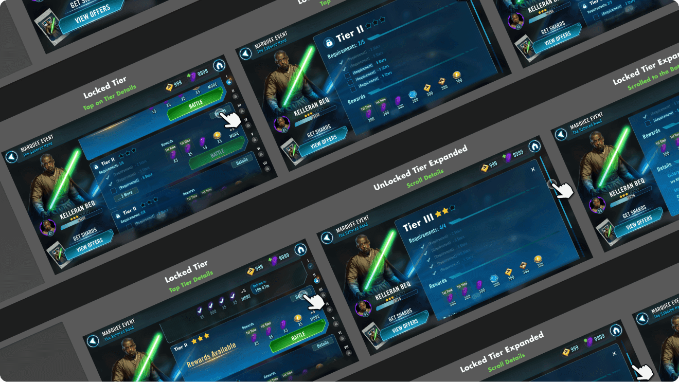 We also addressed momentum breaks when players returned to the event. The experience now auto-centers on the next actionable tier, keeping players in flow instead of forcing them to scroll to reorient. These updates reinforced the clarity-first design and helped the Marquee framework remain readable, efficient, and scalable as new events rolled out.
